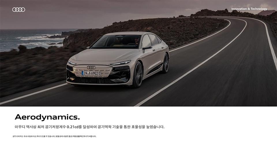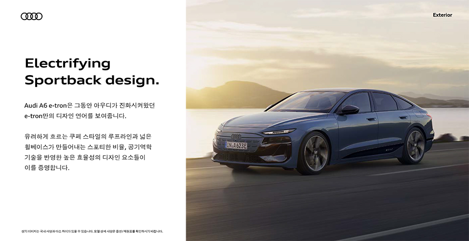A6 e-트론의 디자인은 한마디로 ‘유려함’과 ‘효율성’의 결합이다. 공기저항계수(Cd) 0.21이라는 수치는 아우디 역사상 가장 낮은 수치로, 고속 주행 시 안정성과 에너지 효율을 동시에 확보했다.
