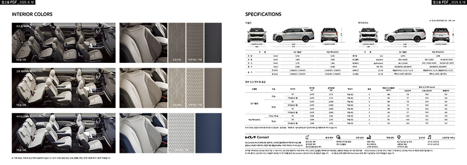 | 가솔린 3.5 | 3,470cc V6 가솔린 | 6,300만 원 ~ 6,800만 원 | 8.5 ~ 8.7km/ℓ | 7인승 / 9인승 | - 정숙한 주행감 - 넉넉한 출력, 장거리 안정성 - 합리적 가격, 전통 내연기관 선호층 인기 |